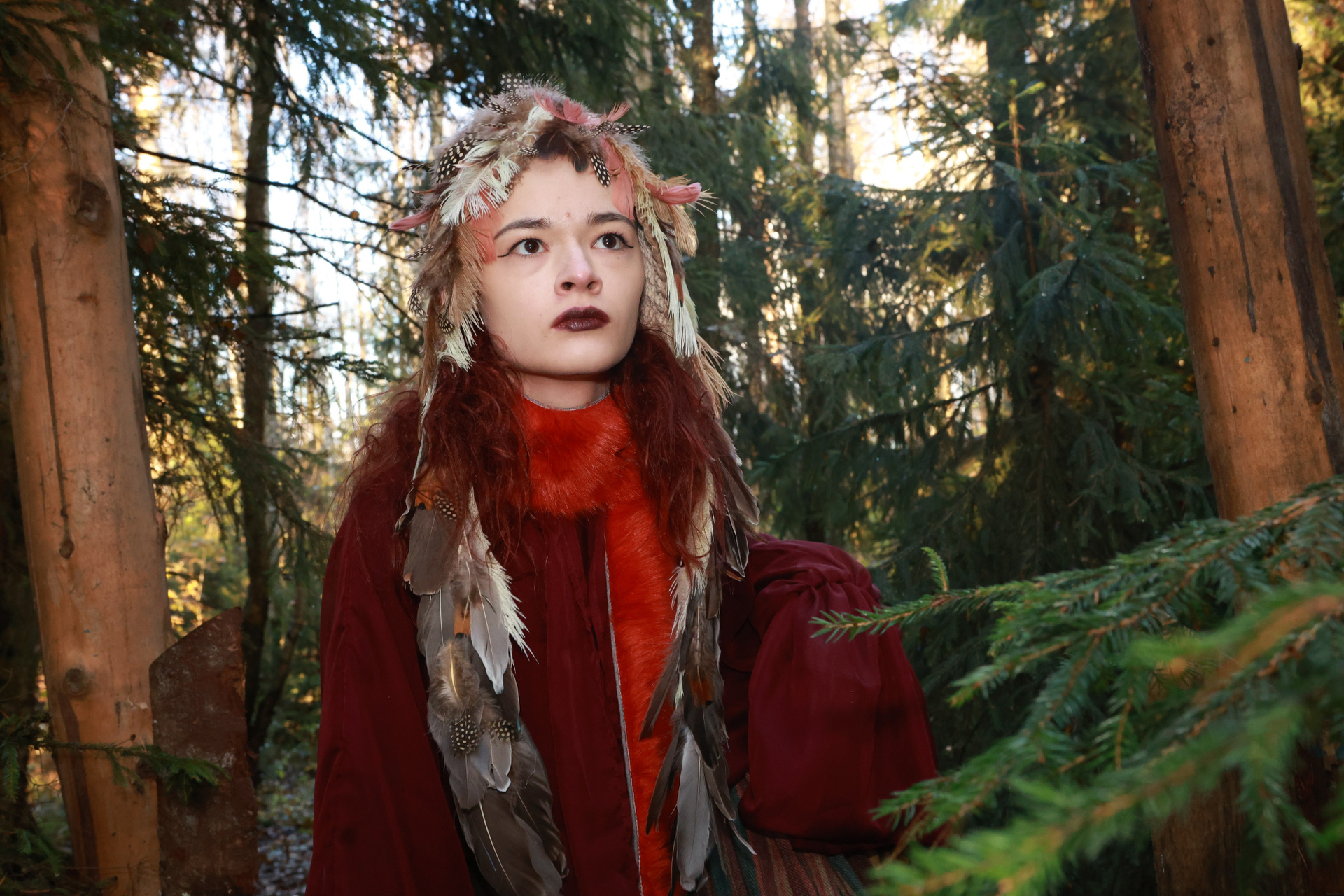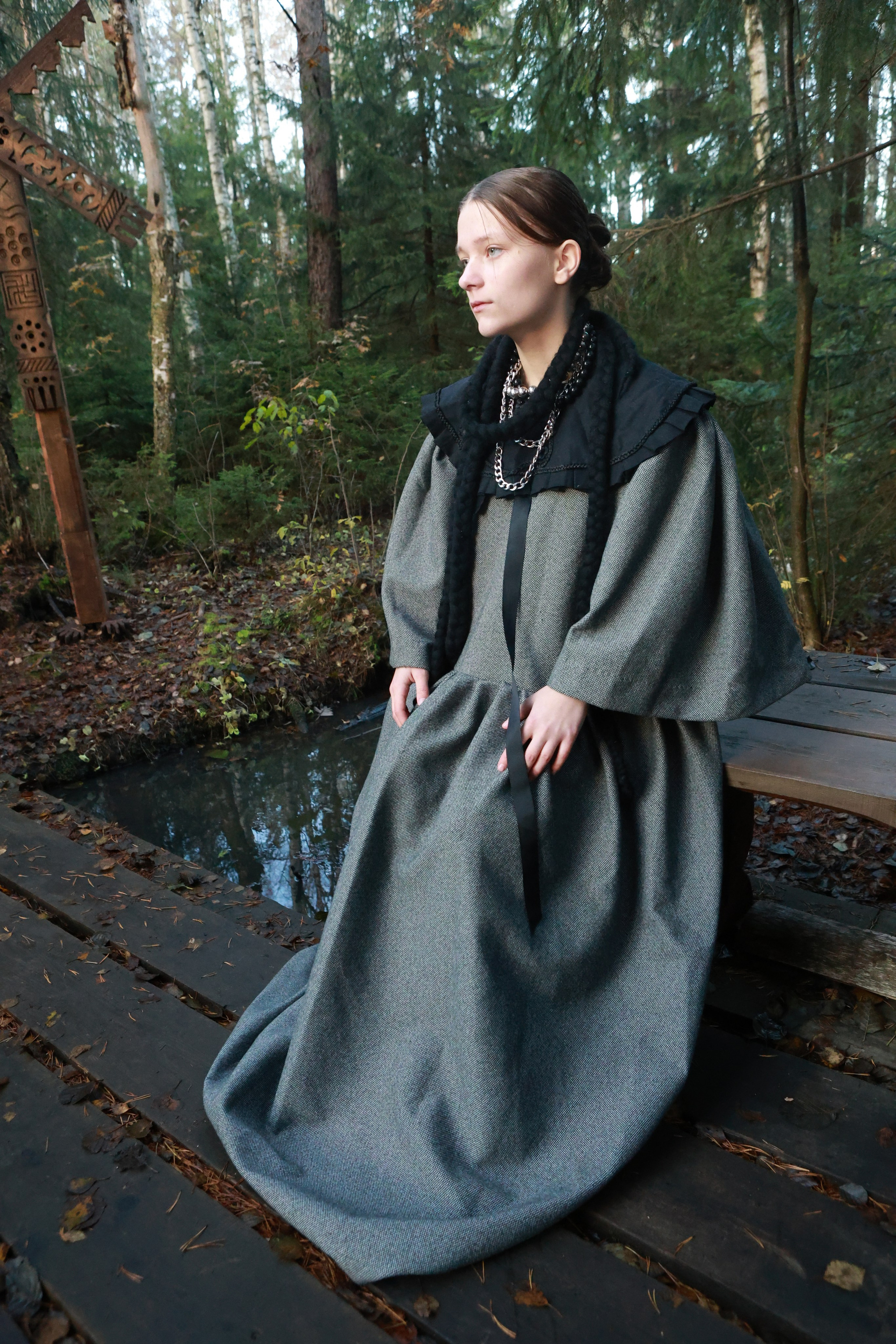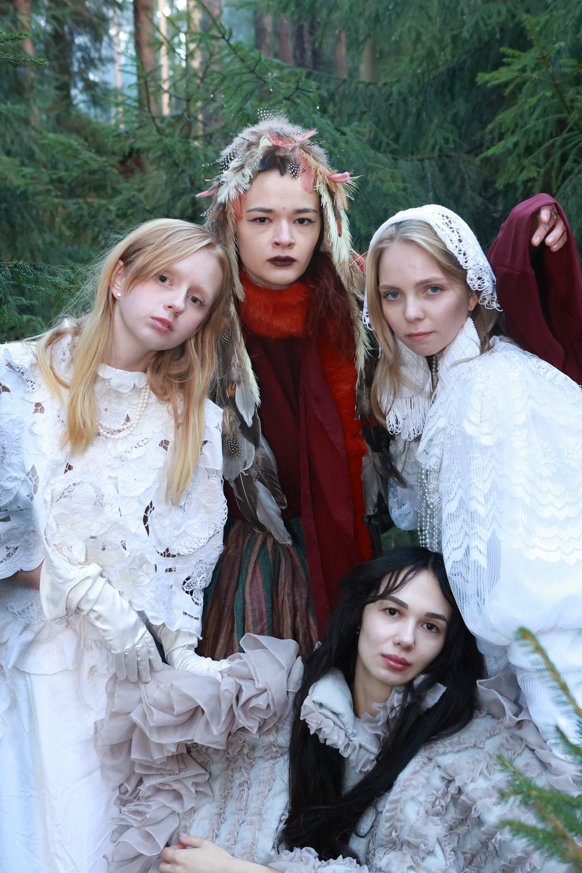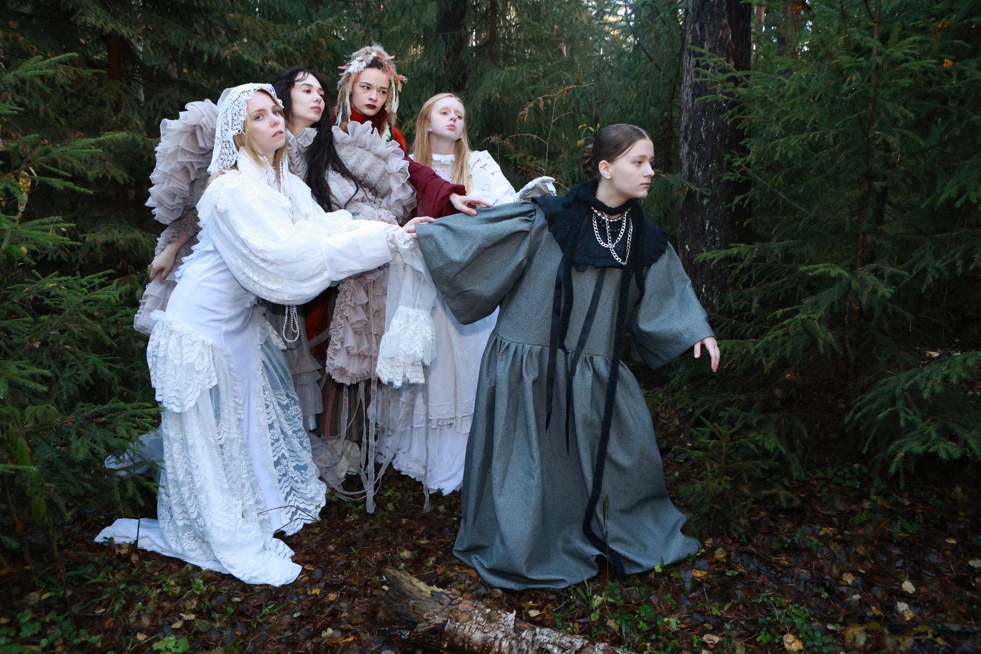 В густой хвойной чаще, где время тает в шелесте игл, пять фигур становятся живым воплощением диалога между прошлым и настоящим. Модели, словно персонажи старинной легенды, тянутся друг к другу, создавая линии, которые переплетаются с ветвями деревьев. Осеннее лесное полотно, усыпанное опавшими листьями, становится сценой, где каждая складка ткани и взгляд несут загадку. Это не просто съемка — это магия, застывшая в кадре.